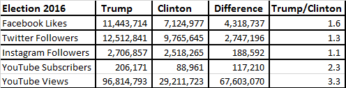 Social media numbers for Trump heavily outpace Clinton.